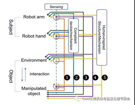 文章介紹了G精度機(jī)器人操控的五類方法:(1)基于傳感信息的方法(2)基于柔順機(jī)構(gòu)的方法(3)基于環(huán)境約束的方法(4)基于感知約束集成的方法(5)仿生的方法。如圖1所示,示意圖展示了五類方法之間的差異。在機(jī)器人操控中,主體是機(jī)器人的手臂和手,客體是環(huán)境和被操控的對(duì)象。虛線表示傳感信息,回路表示傳感器感知到的狀態(tài)。