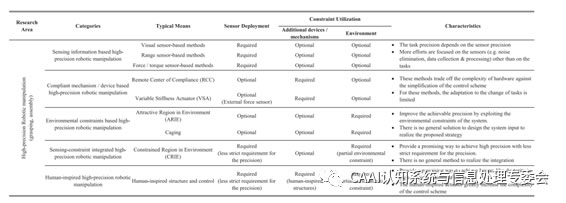 在G精度的抓取和裝配工作中,僅僅依靠機(jī)械手本身的精度不能滿足任務(wù)要求。近期在IEEE TRANSACTIONS ON MECHATRONICS 上發(fā)表的一篇名為《A Survey of Methods and Strategies for High-Precision RoboticGrasping and Assembly Tasks—Some New Trends》的文章對(duì)近年來在機(jī)器人G精度抓取和裝配方面的研究工作進(jìn)行了分類、回顧和比較,并闡述了該L域的研究趨勢(shì)。