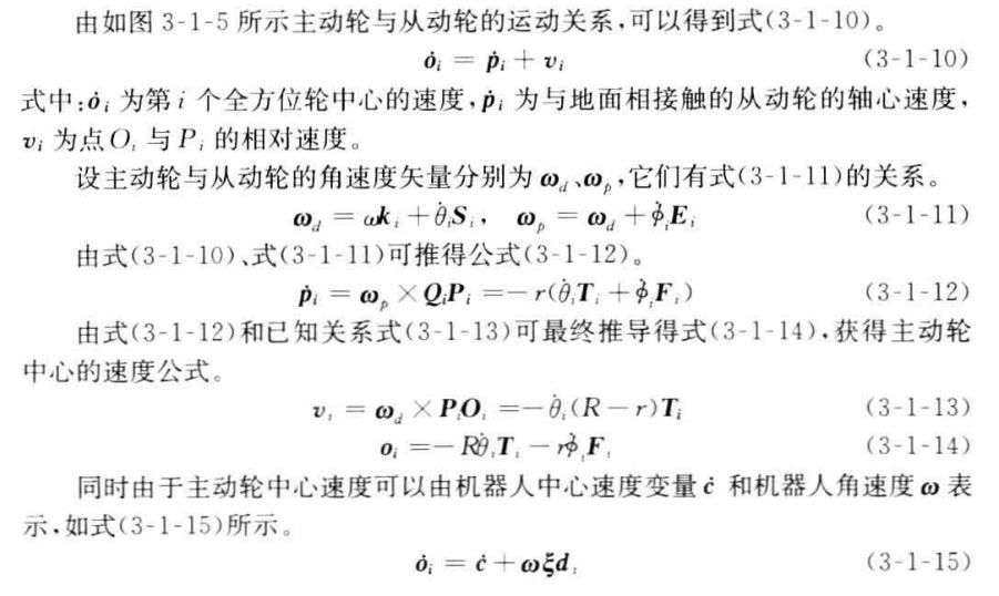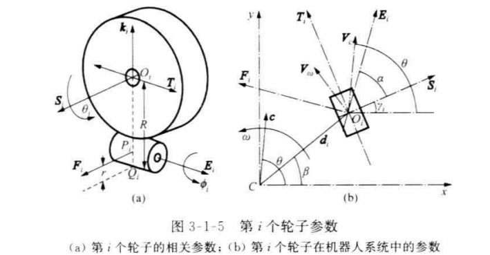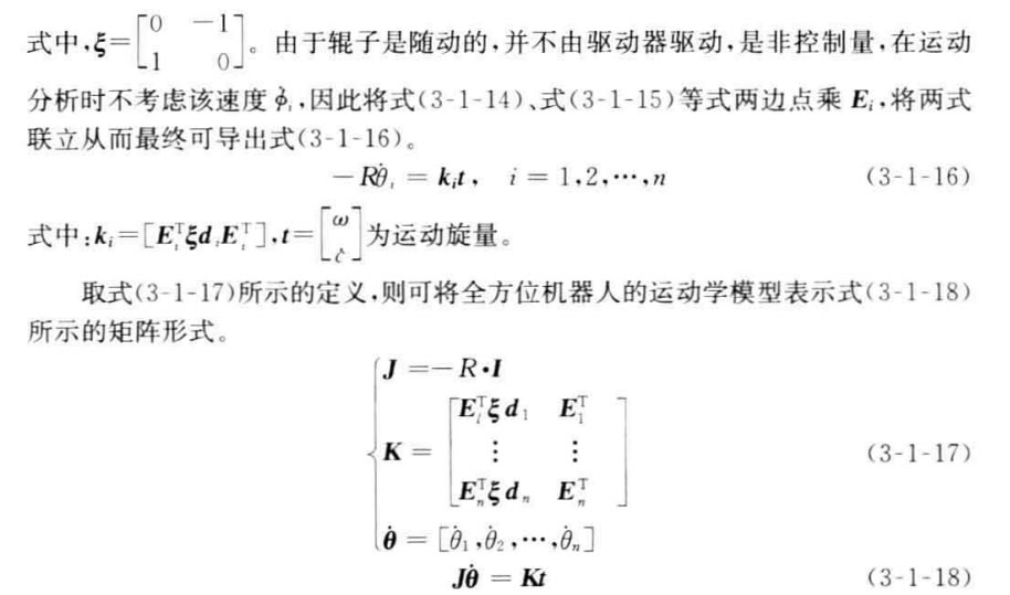具有傳統(tǒng)車輪的機(jī)器人只能有兩個自由度的運(yùn)動,所以在運(yùn)動學(xué)上,它等價于 傳統(tǒng)的陸上車輛。然而,具有全方位輪的機(jī)器人有3個自由度運(yùn)動的能力,即沿著 平面上x 軸、y 軸以及繞自身中心旋轉(zhuǎn)的運(yùn)動能力,這充分增加了機(jī)器人的機(jī)動 性。本節(jié)將給出這種全方位移動機(jī)器人的運(yùn)動學(xué)模型。