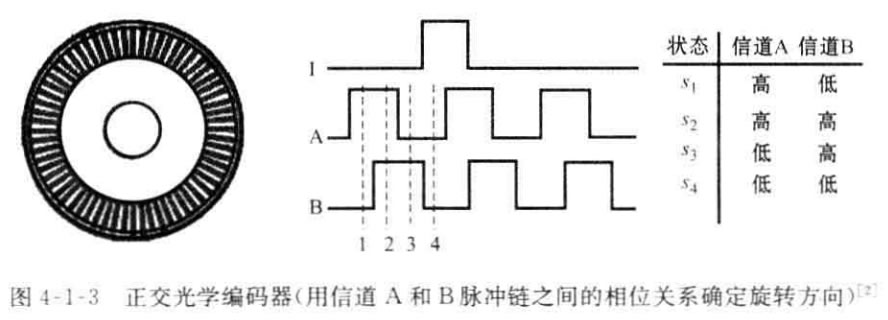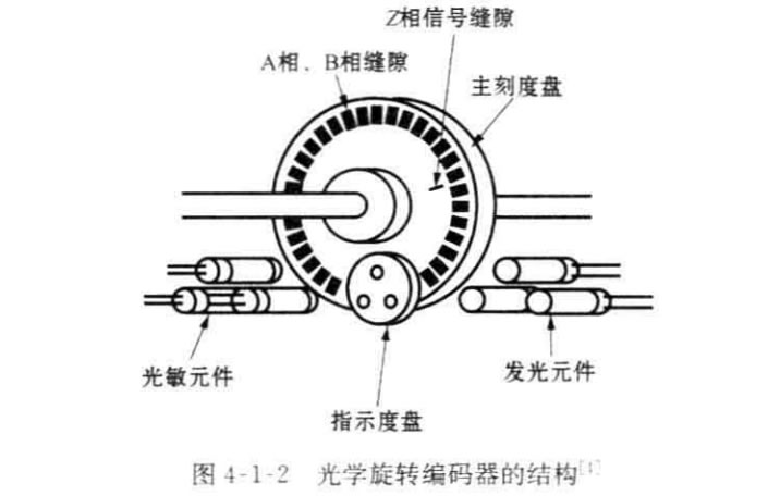 以圖4-1-2為例說明光學(xué)編碼器的結(jié)構(gòu)。光學(xué)編碼器由發(fā)光元件、屏蔽光的固 定光柵、與轉(zhuǎn)軸一起旋轉(zhuǎn)的帶光柵的轉(zhuǎn)盤和固定的光敏元件組成。發(fā)光元件和光敏 元件安放在碼盤的兩側(cè),當(dāng)轉(zhuǎn)盤轉(zhuǎn)動(dòng)時(shí),根據(jù)固定的和運(yùn)動(dòng)的光柵的排列,光敏元件 接收的光通量會(huì)發(fā)生變化。光敏元件輸出的波形經(jīng)過整形后形成脈沖,根據(jù)脈沖計(jì) 數(shù),可以得到固定在碼盤上的轉(zhuǎn)軸的角位移。在測量中,Z后得到的光強(qiáng)信號用閾 值變換成離散的方波,在亮和暗的狀態(tài)之間作選擇。分辨率以每轉(zhuǎn)周期數(shù)(CPR)度量。Z小的角分辨率可以容易地從編碼器的CPR 額定值計(jì)算出。典型的編碼 器可擁有2000 CPR, 而光學(xué)編碼器工業(yè)可容易地制造出具有10000 CPR 的 編 碼 器。當(dāng)然,根據(jù)所需的帶寬,Z關(guān)鍵的是編碼器需要足夠快,以計(jì)算期望的軸轉(zhuǎn)速。