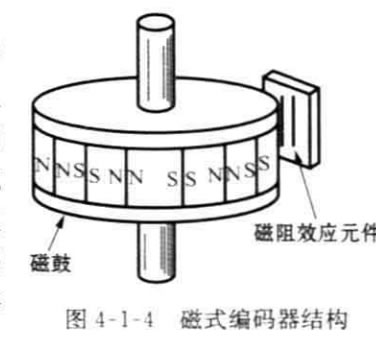 磁式編碼器是通過在強(qiáng)磁性材料表面上等 間隔的磁化刻度標(biāo)尺,標(biāo)尺旁邊相對放置磁阻 效應(yīng)元件或霍爾元件,即能檢測磁通的變化,如 圖4-1-4所示,兩個(gè)磁傳感器的距離恰好是磁化 標(biāo)尺間隔的1/4. 因此可以根據(jù)輸出信號的相位 關(guān)系檢測旋轉(zhuǎn)方向。與光學(xué)編碼器相比,磁式編 碼器的刻度間隔大,但它具有耐油污、抗沖擊等 特點(diǎn)。