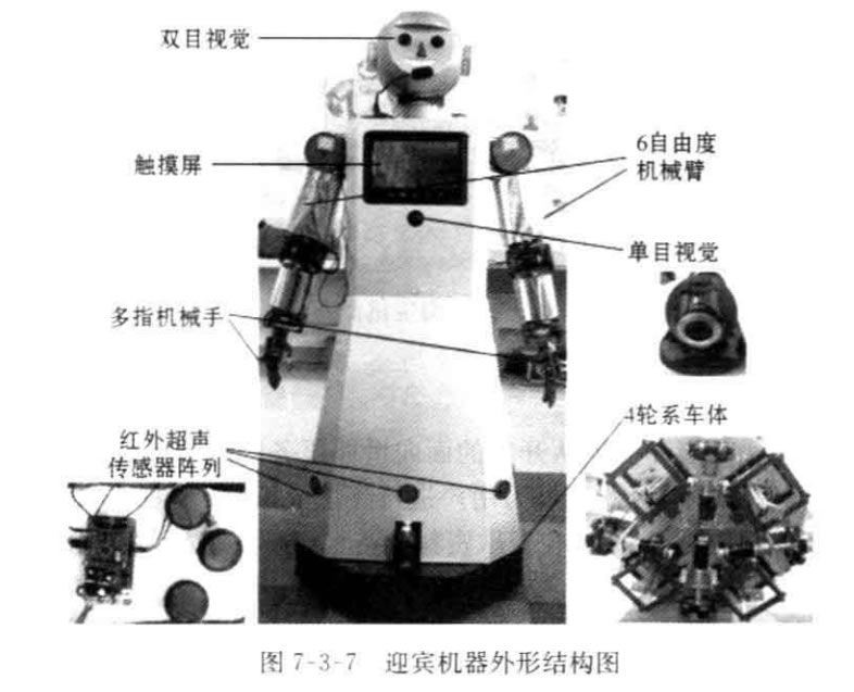 迎賓機(jī)器人采用造型活潑的卡通形象,其外形如圖7-3-7所示,頭部有雙目視覺傳感器,身體部分主要包括觸摸屏、機(jī)械臂和機(jī)械手。身高約1.4~1.5m, 采 用 輪式移動(dòng)方式,Z高移動(dòng)速度約18m/min 。 可自主完成接待、導(dǎo)引、語音提示、點(diǎn) 菜等服務(wù)工作。連續(xù)工作時(shí)間不小于2小時(shí)。主要參數(shù)如下: