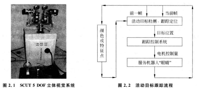 圖2.1所示的服務(wù)機(jī)器人“眼睛”是一個(gè)5 DOF 立體視覺系統(tǒng),它能夠跟蹤和識(shí)別活 動(dòng)的目標(biāo)。它是由 SCUT “智能計(jì)算機(jī)”科研團(tuán)隊(duì)研制成功的。該“眼睛”包括兩個(gè)彩色 攝像機(jī)、圖像處理板、個(gè)人電腦、數(shù)據(jù)采集卡、5個(gè)直流電機(jī)、直流電機(jī)驅(qū)動(dòng)器?紤]到主 動(dòng)跟蹤和目標(biāo)特征與速度和魯棒性等要求,該“眼睛”以基于顏色的跟蹤算法為基礎(chǔ),結(jié) 合目標(biāo)特征跟蹤及目標(biāo)運(yùn)動(dòng)預(yù)測(cè)等就可以對(duì)活動(dòng)目標(biāo)進(jìn)行跟蹤和識(shí)別。