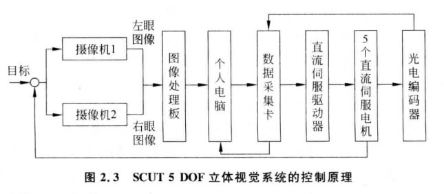 SCUT 5 DOF 立體視覺系統(tǒng)的控制原理如圖2.3所示,兩個(gè)彩色攝像機(jī)拍攝待識(shí)別 目標(biāo)圖像,經(jīng)過圖像處理板后送入個(gè)人電腦進(jìn)行分析,經(jīng)過顏色或特征跟蹤算法處理后, 形成5個(gè)直流電機(jī)的轉(zhuǎn)角控制指令,并經(jīng)由數(shù)據(jù)采集卡和直流電機(jī)驅(qū)動(dòng)器放大后驅(qū)動(dòng)5個(gè)直流電機(jī)轉(zhuǎn)動(dòng),從而帶動(dòng)兩個(gè)攝像機(jī)分別或共同作上、下、左、右、旋轉(zhuǎn)運(yùn)動(dòng),跟蹤待識(shí) 別目標(biāo)。無論待識(shí)別的目標(biāo)怎樣活動(dòng),只要不離開兩個(gè)攝像機(jī)的視覺范圍,這個(gè)跟蹤和 識(shí)別過程就一直持續(xù)地進(jìn)行下去。由圖2 .3可以看到,5個(gè)直流電機(jī)的輸出(它們的轉(zhuǎn) 動(dòng),即兩個(gè)攝像機(jī)的運(yùn)動(dòng))是直接連接到或者說跟蹤目標(biāo)的。