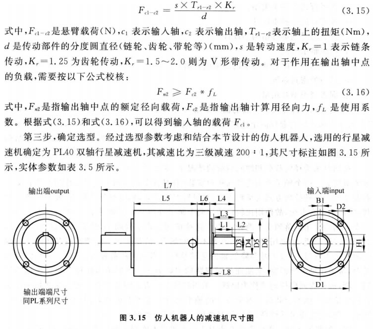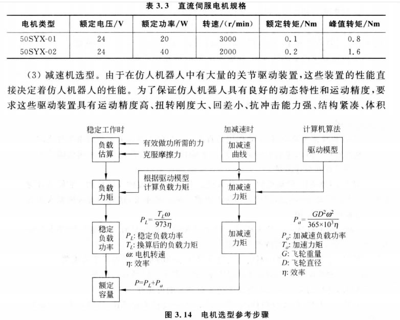 電機是將電能轉(zhuǎn)化為機械能的部件,由此發(fā)生的力經(jīng)過以減速器為核心的動力傳遞 系統(tǒng)到達(dá)負(fù)載端。在此過程中, 一部分力克服摩擦,以熱能的形式耗散出去,因此傳動效 率無法達(dá)到100%。在實際設(shè)計中,應(yīng)該將上述路線的順序倒過來,即以負(fù)載的大小和摩 擦系數(shù)及運動效率去推算電機的容量。施加于電機的負(fù)載大致可以劃分成三種基本類 型:有效力、無效力、慣性力。智能交互機器人的驅(qū)動器大致有直流電機、步進電機、舵機。如 圖3.14所示為電機選擇的方法和步驟。從圖中可知,決定電機容量時,涉及負(fù)載估算、 驅(qū)動對象運動規(guī)律確定、傳動系統(tǒng)轉(zhuǎn)動慣量折算等內(nèi)容[96]。