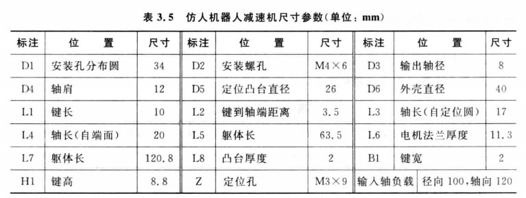 (2)直流伺服電機選型。根據(jù)上面的分析,為本節(jié)設(shè)計的智能交互機器人選用了兩種 類型的直流伺服電機,分別是上海瑞克科技發(fā)展有限公司的50SYXB-01 和 5 0SYXB- 02,質(zhì)量大約為0.5~1.0kg, 規(guī)格如表3.3所示。從表中不難看出這種直流伺服電機 轉(zhuǎn)速非常高,Z高可達(dá)到3000r/min(轉(zhuǎn)/分鐘);而其轉(zhuǎn)矩又很小,不能直接用于關(guān)節(jié)驅(qū) 動裝置。