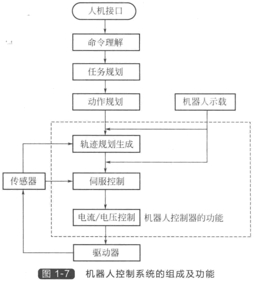 對(duì)于一個(gè)具有高度智能的機(jī)器人,它的控制系統(tǒng)實(shí)際上包含了“任務(wù)規(guī)劃” “動(dòng)作規(guī)劃”“軌跡規(guī)劃”和基于模型的 “伺服控制”等多個(gè)層次,如圖1-7所示。 機(jī)器人先要通過(guò)人機(jī)接口獲取操作者的 指令,指令的形式可以是人的自然語(yǔ)言, 或者是由人發(fā)出的專用的指令語(yǔ)言,也可 以是通過(guò)示教工具輸入的示教指令,或者 鍵盤輸入的機(jī)器人指令語(yǔ)言以及計(jì)算機(jī)程