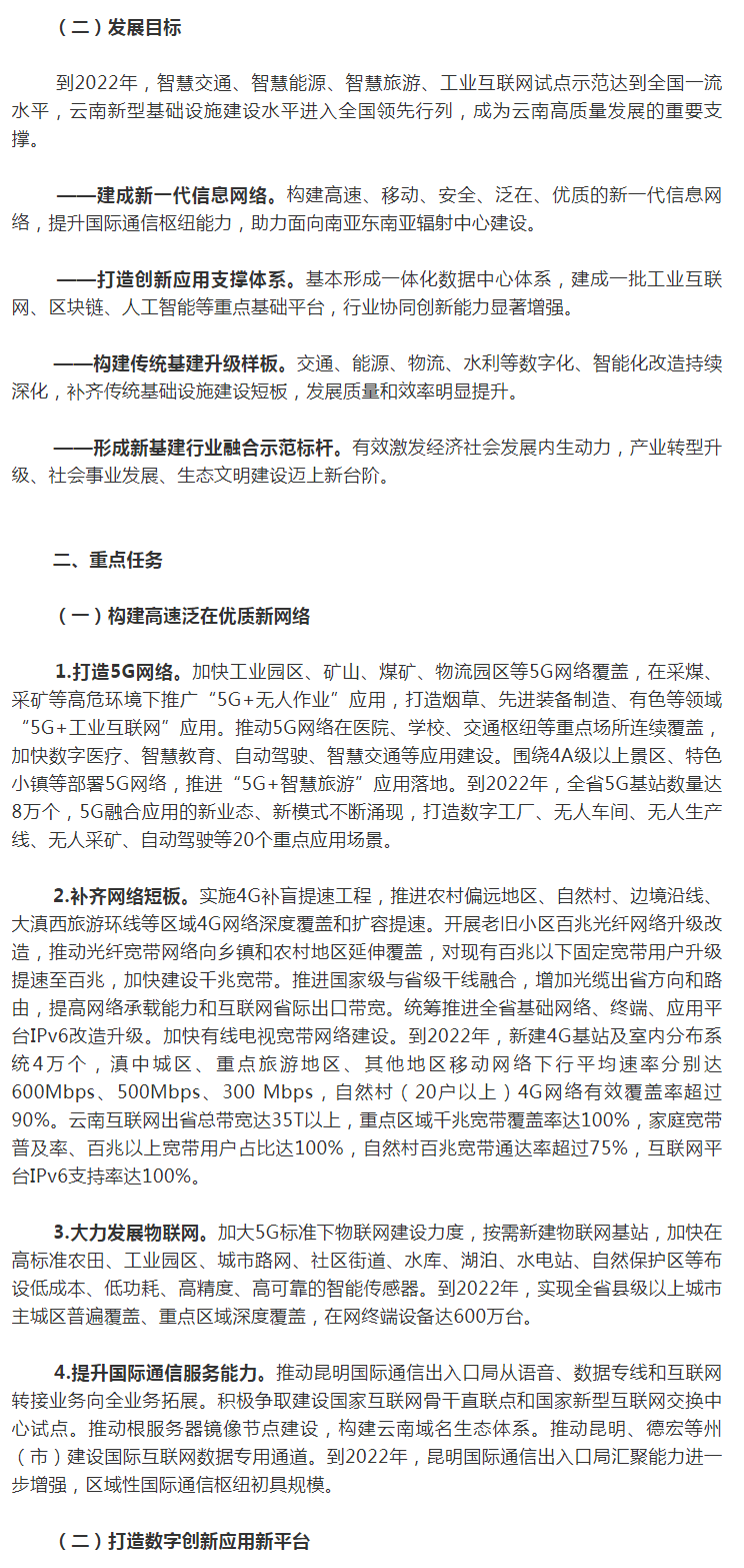 為認(rèn)真貫徹落實(shí)黨、國務(wù)院關(guān)于推進(jìn)新型基礎(chǔ)設(shè)施建設(shè)的重大決策部署,深入實(shí)施“云上云”行動(dòng)計(jì)劃,加快云南省新型基礎(chǔ)設(shè)施建設(shè)步伐,提升經(jīng)濟(jì)社會(huì)發(fā)展支撐能力,結(jié)合云南省實(shí)際,制定本實(shí)施方案。