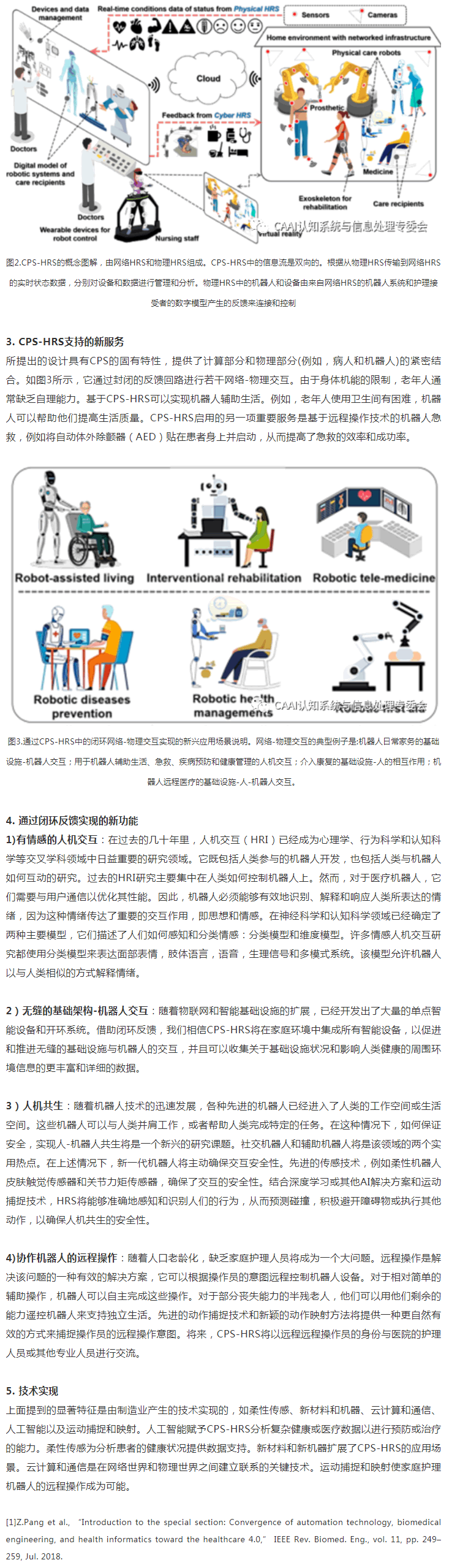 基于CPS的家庭護(hù)理機(jī)器人系統(tǒng)(CPS-HRS)正在經(jīng)歷一種設(shè)計(jì)范式的轉(zhuǎn)變,從開(kāi)放的小循環(huán),單回路向閉合的大循環(huán),多回路的轉(zhuǎn)變。典型的網(wǎng)絡(luò)物理耦合系統(tǒng)由三部分組成:網(wǎng)絡(luò)部分、物理部分和網(wǎng)絡(luò)物理交互模塊。這三個(gè)部分通過(guò)這些回路緊密相連。網(wǎng)絡(luò)部分包括傳感、驅(qū)動(dòng)、計(jì)算和通信硬件/軟件。物理部分由護(hù)理接受者、醫(yī)生、家庭成員和機(jī)器人組成。網(wǎng)絡(luò)物理交互模塊由數(shù)據(jù)處理、分析和傳輸模塊、接口模塊和控制模塊組成。