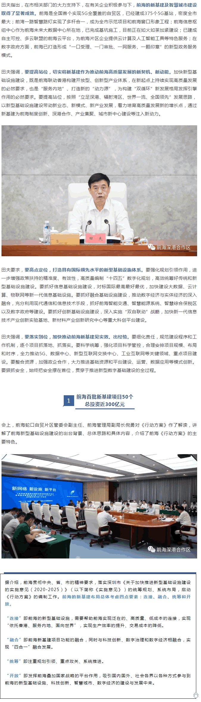 8月6日,前海蛇口自貿(mào)片區(qū)管委會舉行“《加快新型基礎設施建設推動前海數(shù)字經(jīng)濟G質(zhì)量發(fā)展的行動方案(2020-2025年)》發(fā)布暨專項行動工作會議”,正式發(fā)布實施《加快新型基礎設施建設推動前海數(shù)字經(jīng)濟G質(zhì)量發(fā)展的行動方案(2020—2025年)》(下稱《行動方案》)。這是深圳市《關(guān)于加快推進新型基礎設施建設的實施意見(2020-2025)》出臺之后,全市加快推進新基建的行動方案,計劃實施32項新型基礎設施行動,包括信息基礎設施建設9項行動、融合基礎設施建設12項行動、創(chuàng)新基礎設施建設11項行動,首批重點項目50個、總投資近300億元。