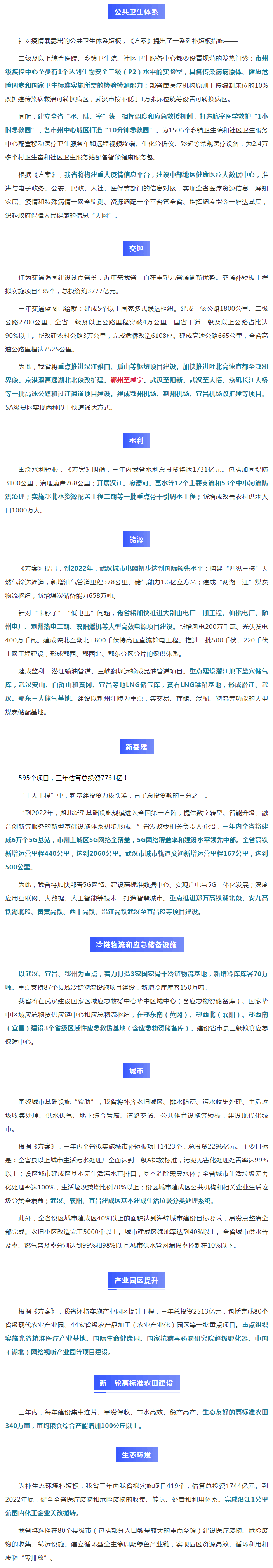 近日,湖北省印發(fā)《湖北省疫后重振補短板強功能“十大工程”三年行動方案(2020—2022年)》(以下簡稱《方案》),啟動疫后重振“十大工程”。 根據(jù)《方案》,我省將聚焦公共衛(wèi)生體系、交通、水利、能源、新基建、冷鏈物流和應(yīng)急儲備設(shè)施、城市、產(chǎn)業(yè)園區(qū)提升、新一輪G標準農(nóng)田建設(shè)、生態(tài)環(huán)境等十大L域,用三年時間實施一批打基礎(chǔ)、補短板、強功能、利長遠、惠民生的重大項目。截至目前,“十大工程”滾動項目庫項目達4572個,估算總投資約2.3萬億元。