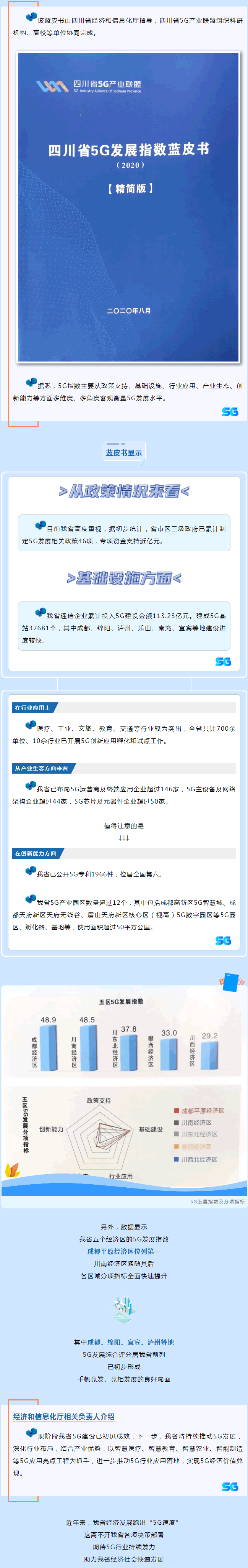 四川省5G產(chǎn)業(yè)聯(lián)盟牽頭編制的《四川省5G發(fā)展指數(shù)藍(lán)皮書(2020版)》(下簡(jiǎn)稱:5G發(fā)展指數(shù))首次發(fā)布。此次發(fā)布的藍(lán)皮書由省經(jīng)濟(jì)和信息化廳指導(dǎo),四川省5G產(chǎn)業(yè)聯(lián)盟組織科研機(jī)構(gòu)、G校等單位協(xié)同完成。該藍(lán)皮書顯示,四川5G建設(shè)已初見(jiàn)成效:通信企業(yè)累計(jì)投入5G建設(shè)金額113.23億元;在創(chuàng)新能力方面,已公開5G專利1966件,位居全國(guó)第六,5G產(chǎn)業(yè)園區(qū)數(shù)量超過(guò)12個(gè);在產(chǎn)業(yè)生態(tài)方面,已布局5G運(yùn)營(yíng)商及終端應(yīng)用企業(yè)超146家,5G主設(shè)備及網(wǎng)絡(luò)架構(gòu)企業(yè)超44家,5G芯片及元器件企業(yè)超50家。