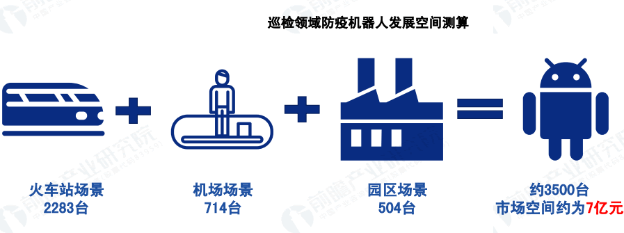 假設(shè)三等站配備1臺巡檢機器人、二等站配備2臺、一等站配備3臺、特等站配備4臺、民航機場配備3臺、每個園區(qū)配備3臺,巡檢L域防疫機器人的需求量約為3500臺。按照每臺機器人20萬元的價格計算,巡檢L域防疫機器人的市場空間約為7億元。