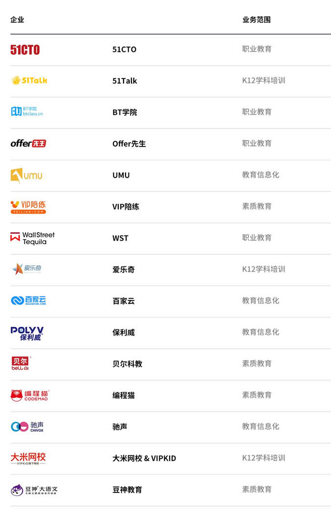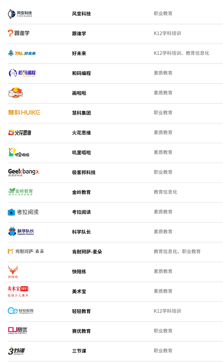 掌門教育、好未來(lái),新東方在線、說(shuō)客英語(yǔ)、猿輔導(dǎo)、跟誰(shuí)學(xué),有道,大米網(wǎng)校,作業(yè)幫,輕輕教育,51talk,愛(ài)樂(lè)奇,悉之教育,卓世未來(lái)