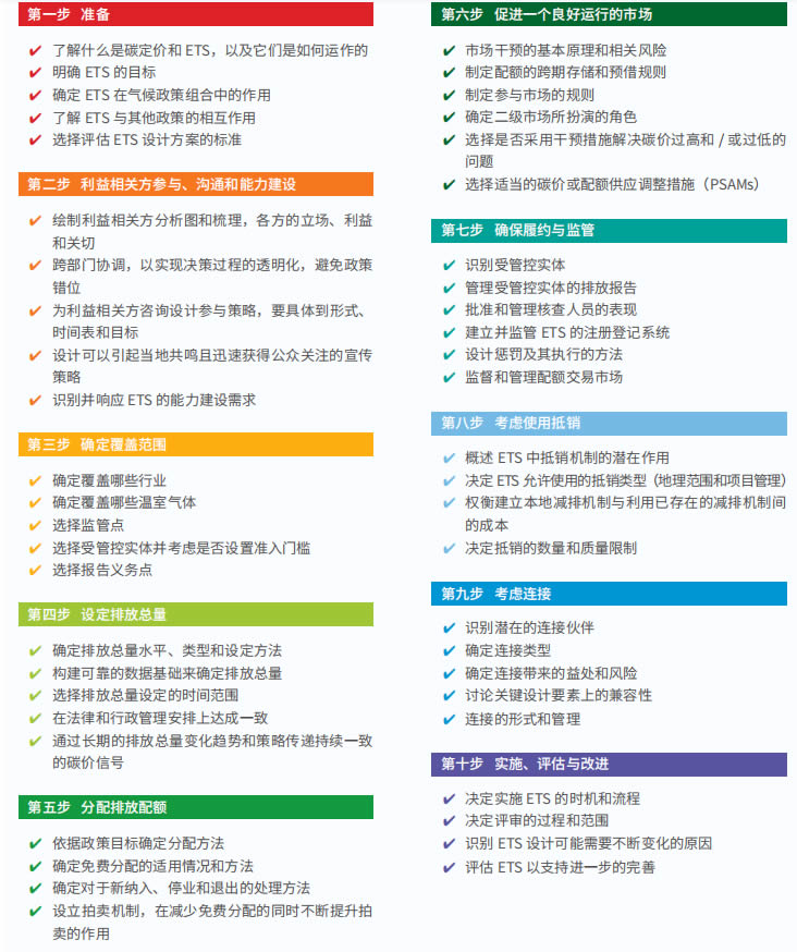 這些步驟之間相互依存,每一步所作的選擇都將對(duì)其他步驟的決策產(chǎn)生重要影響。在實(shí)踐中,ETS 的設(shè)計(jì)過(guò)程是“迭代”而 非“線性”的。2016 年初版手冊(cè)發(fā)布之后,隨著 ETS 在各個(gè) 國(guó)家和地區(qū)的發(fā)展,很多新見(jiàn)解、新方法和新設(shè)計(jì)思路都影響著 ETS 的運(yùn)行方式,也進(jìn)一步加深了我們對(duì)于 ETS 的理解和認(rèn)識(shí)。所有這些新內(nèi)容我們都在本手冊(cè)的相關(guān)章節(jié)中予以更新。