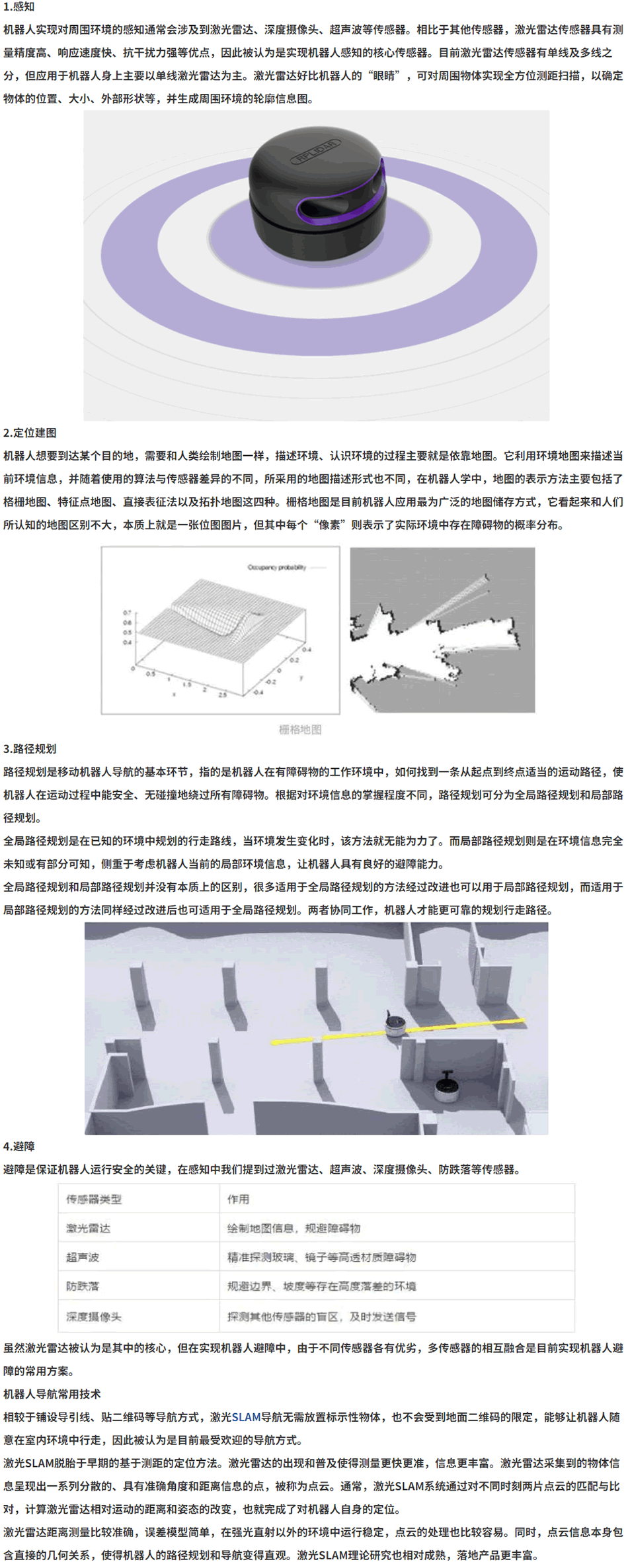 實(shí)現(xiàn)機(jī)器人導(dǎo)航的基本環(huán)節(jié)有四個(gè)步驟:感知、定位建圖、路徑規(guī)劃和避障