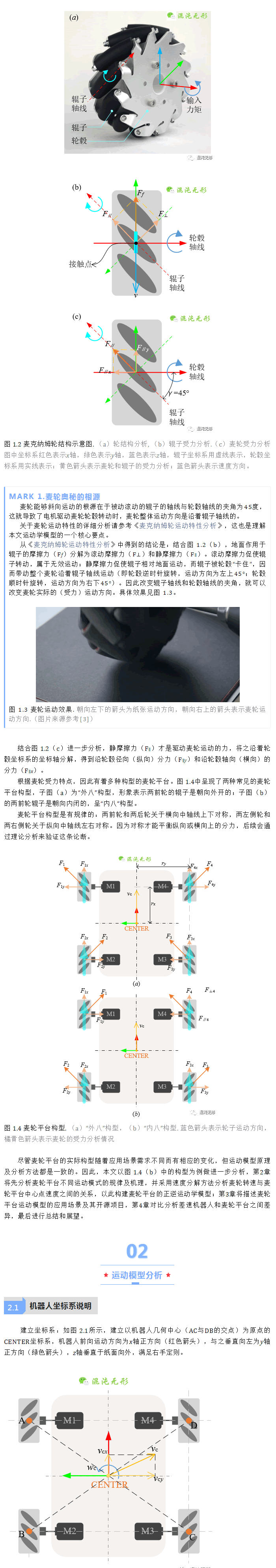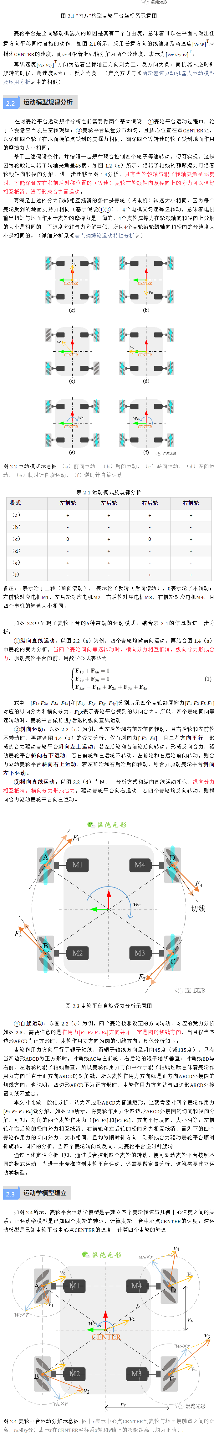 麥輪平臺(tái)就是由四個(gè)麥克納姆輪按照一定規(guī)律排布組成的移動(dòng)平臺(tái),麥輪平臺(tái)能夠全向移動(dòng)主要依賴于具有特殊構(gòu)型的麥輪(由輪轂和輥?zhàn)咏M成,見(jiàn)圖 1.2(a)),而大的亮點(diǎn)是麥輪能夠斜向運(yùn)動(dòng)。(重點(diǎn):關(guān)于麥輪構(gòu)型、受力及速度的分析見(jiàn)文章《麥克納姆輪運(yùn)動(dòng)特性分析》)