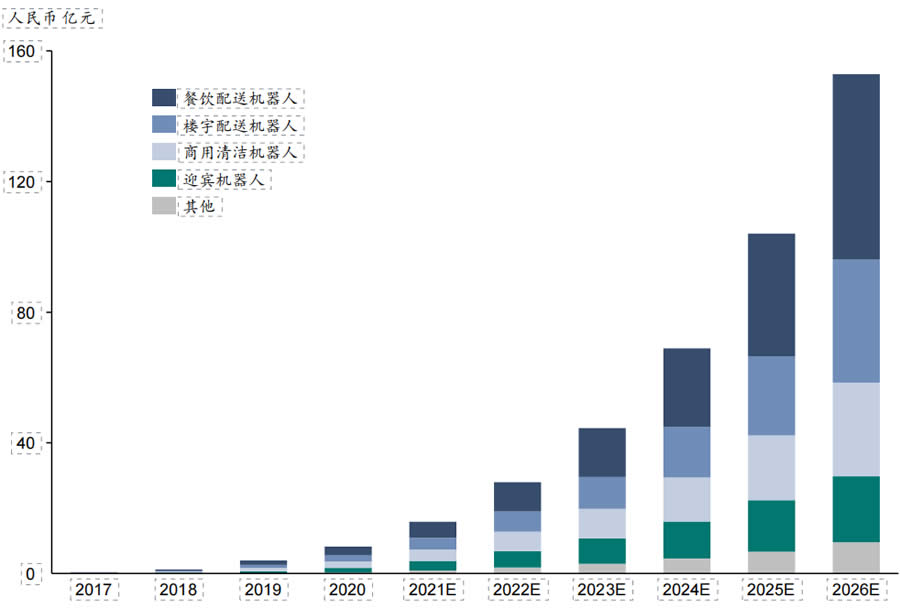推進(jìn),中國(guó)商用服務(wù)機(jī)器人行業(yè)將迎來(lái)快速增長(zhǎng),預(yù)計(jì)2026年市場(chǎng)將超過(guò)150億元人民幣,其中餐飲配送機(jī)器人、商用清潔機(jī)器人、樓宇配送機(jī)器人為前三大