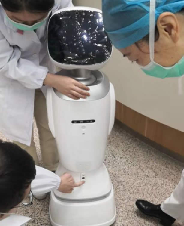 輪式移動(dòng)機(jī)器人,由六麥克風(fēng)陣列、多 攝像頭模組、激光導(dǎo)航雷達(dá)等組成,可實(shí)現(xiàn)無人導(dǎo)診,自動(dòng)響應(yīng)發(fā)熱問診、引L病人初步診療,并可實(shí)現(xiàn)醫(yī)生對(duì)病人的遠(yuǎn)程診療